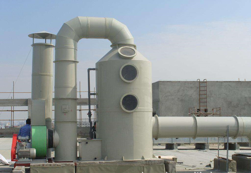 玻璃鋼酸性氣體吸收塔,塔內氣體由風機送入,氣體由下向上。吸收液由耐酸泵打入塔頂通過布液裝置均勻向下噴淋。形成逆流吸收,中合后的氣體經塔內除霧段后,經煙筒排入大氣,不同的酸性氣體采用不同的吸收液體吸收。采用氫氧化鈉溶液作吸收中和液,當溶液濃度2--6%時凈化鹽酸酸霧效率可達98%以上;凈化硫酸酸霧效率可達97%以上;凈化硝酸酸霧效率可達90%以上。 采用次氯酸鈉溶液作吸收中和液凈化含氰廢氣效率達95%以上。