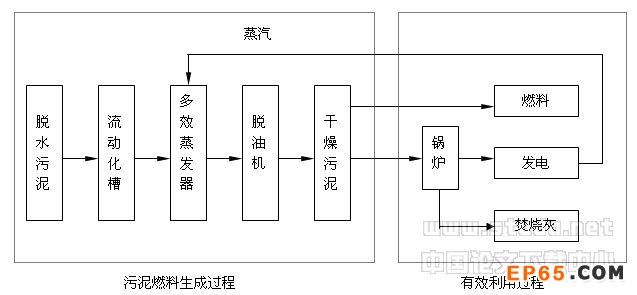 SF法工藝流程如圖2所示。它將未消化的混合污泥經(jīng)過(guò)機(jī)械脫水后,加入重油,調(diào)制成流動(dòng)漿液送入四效蒸發(fā)器蒸發(fā),然后經(jīng)過(guò)脫油,變成含水率約5%、含油率10%以下,熱值為23027kJ的污泥燃料。重油返回作污泥流動(dòng)介質(zhì)重復(fù)利用,污泥燃料燃燒產(chǎn)生蒸汽,作為污泥干燥的熱源和發(fā)電,回收能量。
