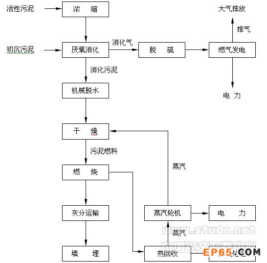 HERS法與SF法不同,一是前者污泥先經(jīng)過(guò)消化,消化氣和蒸汽發(fā)電相結(jié)合回收能量。后者不經(jīng)過(guò)污泥熱值降低的消化過(guò)程,直接將生成污泥蒸發(fā)干燥制成燃料;二是HERS法使用的污泥流動(dòng)媒體是輕質(zhì)溶劑油,黏度低,與含水率80%左右的污泥很難均勻混合,蒸發(fā)效率低,而SF法采用的是重油,與脫水污泥混合均勻。三是HERS法輕溶劑油回收率接近100%,而SF法重油回收率較低,流動(dòng)介質(zhì)要不斷補(bǔ)充。